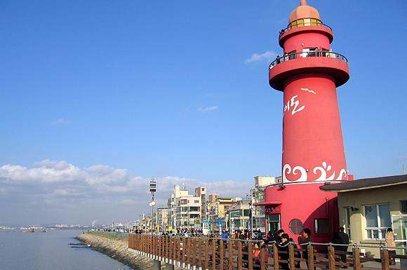 어시장 입구에서 버스를 내리면 쿵작거리는 품바 엿장수와 솜사탕을 파는 수레들이 시끌벅적하게 시선을 끌지만 그 보다 먼저 나그네를 낚아채는 건 제방도로 위에 세워진 빨간색 등대 모양의 낙조전망대. 오이도의 명물인 낙조전망대는 일반 건물의 6~7층 높이에 원형으로 설계돼 있다. 이 곳에 오르면 시내 풍경은 물론 서해의 일몰, 시화방조제와 저 멀리 인천 송도 신도시의 위용까지 한눈에 들어온다.
