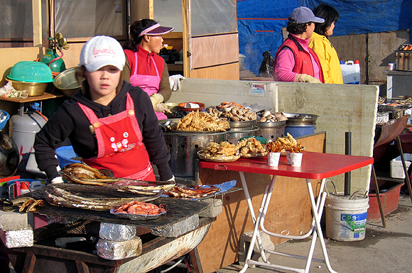 포구로 나가면 길게 늘어선 포장마차마다 그야말로 ‘곱게 늙은 주모가 간데라 불빛 쓰고 / 푸지게 썰어주는 파도 소리 한 접시’며, 즉석에서 회를 뜨는 아낙의 빠른 손놀림, 숯불에 장어를 굽는 하얀 연기가 해안 풍경을 맛있게 만든다. 드럼통에 불을 지펴 놓고 산더미처럼 쌓아 놓은 석화를 굽는 풍경도 쉬 볼 수 있다.