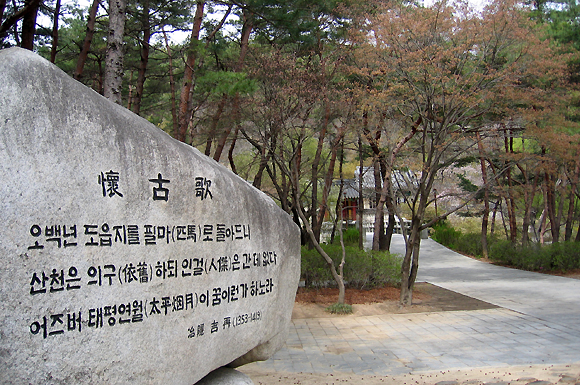 금오산으로 오르는 길목 초입, 소나무가 숲을 이룬 송림 사이에 위치한 채미정 앞으로 계곡을 가로지른 다리가 놓였다. 이 다리를 건너기 전 먼저 만나게 되는 것이 큰 바위에 새겨진, 길재의 그 유명한 회고가(懷古歌)이다.