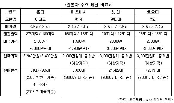 미국시장에서는 캠리와 어코드가 박빙의 승부를 벌이고 있고, 알티마 역시 선전하고 있다. 반면 랜서의 판매는 다소 저조하다. 업계는 이런 반응이 국내에 판매될 일본차들에도 그대로 적용될 것으로 업계는 전망한다.