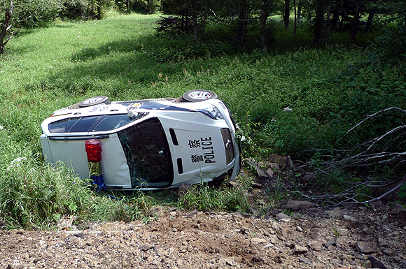 남파 산문에서 출발 때부터 우리 차를 휙휙 앞지르며 가파른 길을 시속 120km가 넘는 속도로 달려대던 중국 공안차가 얼마 후 결국 길 아래로 나뒹그러진 모습을 보여줬다.
