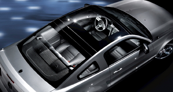 지붕 전체를 유리로 덮은 올 글라스 루프 스타일의 쿠페는 데뷔 45주년을 맞아 머스탱이 처음 시도하는 모델로, 차내에서도 하늘을 비롯한 외부 풍경 전체를 담을 수 있다. 곡선의 글라스 루프는 쿠페 본연의 아름다운 선을 살렸고, 태양광 반사유리를 사용해 실내온도 상승과 직사광선으로 인한 내장재 변색 또는 변형을 차단했다. 2중으로 접합된 유리 사이에는 소음이나 떨림 등을 흡수하는 방음용 필름을 끼워 넣어 진동과 소음을 줄였다. 유리 아랫 부분에는 롤러 블라인드를 장착해 실내로 유입되는 빛의 양을 조절할 수 있다. 머스탱 컨버터블은 컨버터블 모델 최초로 미국 고속도로교통안전국이 실시한 신차 충돌테스트에서 별 5개를 획득했다.