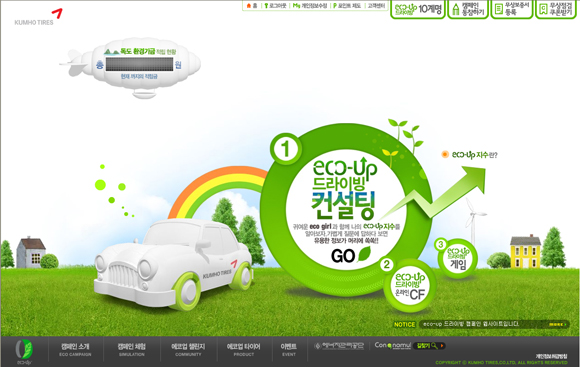 한편, 금호는 친환경 경영에 맞춰 "에코업 드라이빙"이라는 주제로 다양한 친환경 캠페인을 벌일 계획이다. 회사측은 먼저 에코업 웹사이트(eco-up.kumhotire.co.kr) 구축을 통해 방문자들이 문제를 풀며 올바른 운전습관과 에코업 지수를 진단할 수 있도록 했으며, 웹사이트 내 캠페인 동참을 클릭하면 독도 환경기금으로 적립돼 코리아독도녹색운동연합의 독도 환경정화활동에 전액 쓰여진다.