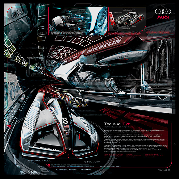 아우디의 ‘R25’는 2006~08년의 3년 연속으로 르망 24시간 내구 레이스를 제패한 ‘R10’을 계승하는 디자인을 선보였다. 이 차의 파워 트레인은 파격에 가까운 진보를 보여 줘 최대출력 680마력, 최대 토크 106kg.m의 강력한 전자 모터를 채용했다. 최고속도는 800km로 리니어 모터(직선 운동을 하는 모터)카의 세계를 보여주고 있다.