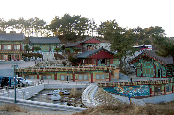 이런저런 호기심을 가진 이들이 산언덕으로 이어지는, 편도에 가까운 좁은 진입로를 따라 휴휴암을 찾아가면 입이 떠억 벌어지는 광경과 마주하게 된다. 작은 암자쯤으로 생각되던 이름과 달리 유명 사찰에 뒤지지 않는 큰 규모며, 거대한 불상에, 번쩍거리는 황금색 범종이 놀라우면서도 생소한 풍경이다. 절집이라면 으레 오랜 역사가 묻어나는 고풍스런 분위기를 먼저 떠올리게 되고, 그에 어울리는 빛바랜 단청이며 종루, 이야기가 전해내려오는 문화재 한두 점쯤은 갖춰져 있는 게 아니던가.
