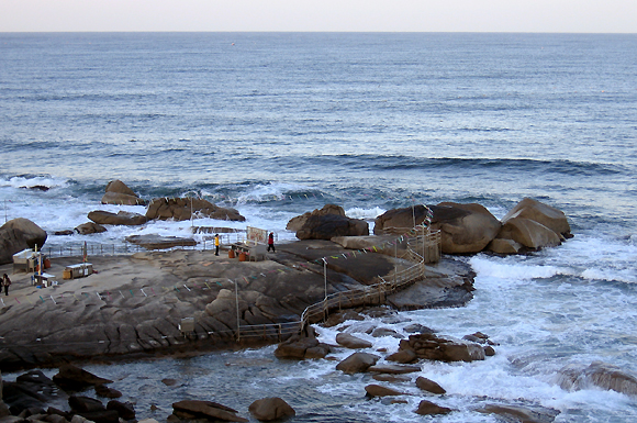 오히려 그보다 더 인상적이었던 건 방생한 물고기들이 탁 트인 바다로 나가지 않고 먹이를 받아먹기 위해 너럭바위 주변에 오글거리며 모여 있는 모습이다. 마치 양식장의 물고기처럼 바글거리는 그 모습에 왠지 측은지심이 든다.
