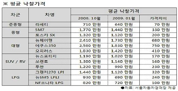 반대로 중고차 수요는 상승곡선을 긋고 있다. 잇딴 중고차시세 하락이 장점으로 작용해 구매를 미뤄 왔던 잠재고객이 실구매자로 전환되고 있기 때문이다. 경매장 관계자는 "중형, 준대형차의 경우 평균적으로 시세하락 이전에 비해 낙찰가격이 100만~300만원 정도 낮게 형성되고 있다"며 "SM7 1,360만원, 로체 840만원, 토스카 SX 1,100만원으로 작년 10월에 비해 각각 350만원, 100만원, 250만원 하락했다"고 말했다. 가격하락세와 반대로 중형, 준대형의 낙찰률은 전년동월보다 56%, 3%나 올랐다.