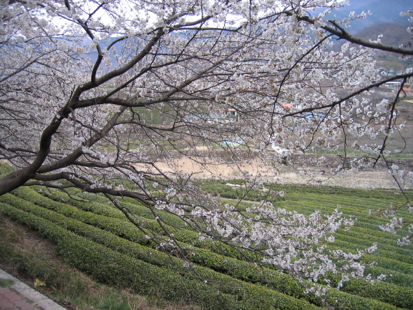 | 녹색 차밭과 어우러진 벚꽃. |