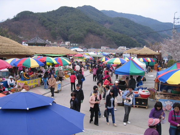 장터는 대장간에 엿장수, 주막을 비롯해 녹차, 산나물, 재첩 등 이 곳 특산품을 파는 가게들까지 제법 구색을 갖췄다. 축제기간 전후에는 약장사에 여러 좌판상들까지 합류해 걸음을 옮겨 놓기 힘들 정도로 장터가 붐빈다. 음식점마다 전국에서 몰려온 손님들로 넘쳐난다. 은어회와 재첩국, 참게장을 전문으로 한다는 음식점엔 앉을 자리조차 없다. 아직 은어철이 아니건만 어디에서 은어를 구해오는지, 잠깐 의문이 든다.