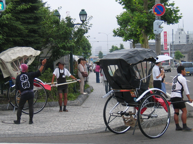 이 곳에서 볼 수 있는 또 다른 명물은 관광인력거. 수건으로 머리를 동여매고 ‘지카다비(발가락이 갈라진 일본인의 신발)’를 신은 젊은 청년들이 유쾌한 모습으로 인력거를 끈다. 손님을 태우지 못한 인력거는 나무받침대를 받쳐 주차해놓고 있다. 20대 정도의 관광인력거가 이 곳에서 성업중인데, 모두 같은 회사에 소속된 인력거라고 한다. 인력거를 끄는데도 자격증이 필요하고, 이 인력거 한 대의 값이 무려 1,000만원을 넘는다고.