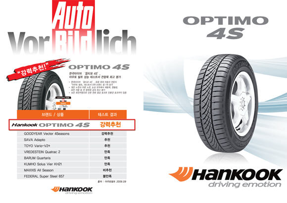포드 피에스타에 14인치 규격(175/65R 14) 타이어를 장착하고 실시한 아우토빌트의 테스트에서는 옵티모 4S가 고성능 타이어의 성능을 측정하는 모든 항목에서 좋은 평가를 받았다. 이 제품은 핸들링 성능 부문에서 모든 기후조건 하에서 최고의 성능을 발휘하며 최고점수를 얻었다. 가장 중요한 안전성 기준인 제동성능에서도 마른 노면은 물론 빗길, 눈길 등 모든 조건에서 최고 평가를 획득한 유일한 타이어로 등재됐다. 아우토빌트는 “옵티모 4S는 테스트를 실시한 타이어 가운데 모든 날씨조건에서 뛰어난 성능을 발휘하는 유일한 타이어”라고 평했다. 또 옵티모 4S는 타사 타이어에 비해 회전저항이 낮아 연료절감효과가 있으며, 독일의 친환경 마크인 블루엔젤을 따낸 유일한 타이어로,친환경성과 고성능을 동시에 구현했다는 호평을 들었다.
