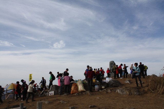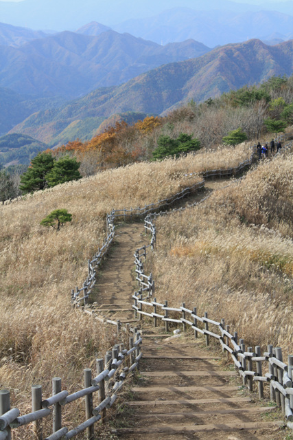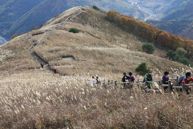 한쪽에서는 그 풍경을 카메라에 담으려는 등산객들로, 다른 한쪽에서는 도시락을 먹는 산행팀들로 민둥산 정상은 시끌벅적하다. 또 더러는 눈앞에 펼쳐지는 억새평원의 장관과 오색단풍 물든 산세에 취해 정상에서 파는 커피 한 잔을, 막걸리 한 사발을 청하기도 한다. “자, 세상에서 가장 맛있는 막걸리가 여깄어요~” 외치는 청년의 목소리가 억새와 함께 춤춘다. 민둥산 억새는 키가 거의 한 길이 넘고 색깔이 매우 짙은 것이 특징이다. 자칫 등산로를 벗어난 길로 들어서게 되면 앞을 가로막는 억새로 인해 걸음을 옮기기 어려울 정도다. 그 때문에 민둥산 억새 군락지는 등산로가 잘 정비되었다. 능선을 따라 구불구불 이어지는 등산로가 산책로처럼 멋스럽다.