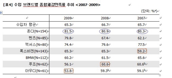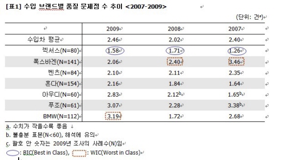 30일 마케팅인사이트의 제9차 연례조사에 따르면 렉서스는 2009년 품질문제가 대당 평균 1.58건으로 가장 적어 1위를 차지했다. 이어 폭스바겐이 2.06건으로 2위, 벤츠가 2.10건, 혼다는 2.16건, 아우디 2.83건 등으로 고장이 많았다. 특히 렉서스는 2007년 이후 3년 연속 수입 브랜드 중 1위를 차지, 초기품질과 내구품질에서 최고라는 명성을 국내에서도 재확인했다. 반면 폭스바겐은 2007년과 2008년 모두 최하위에 머물렀지만 올해 2위까지 올라섰다.