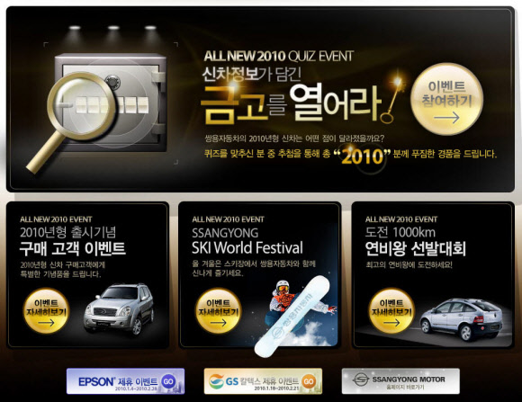 이번 이벤트는 ▲쌍용 스키 월드 페스티벌 ▲GS칼텍스 제휴 이벤트 ▲"금고를 열어라!" 퀴즈 이벤트 등 다양한 행사로 진행된다. 각각의 행사는 영업소나 행사장을 통한 오프라인 이벤트는 물론, 인터넷 이벤트 홈페이지(www.2010smotor.com, 사진)에서도 함께 진행한다.