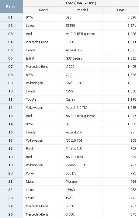 두 번째로 많이 팔린 렉서스 ES350의 신규 등록대수는 2,371대로 작년에 비해 2계단 순위가 상승했다. 하지만 BMW 528은 모두 3,098대가 등록, 700대 가량의 압도적인 차이로 1위를 탈환했다. BMW는 이로써 국내 시장에서의 영광을 되찾았음은 물론, 경쟁관계에 있는 다른 차들이 새로운 세대들을 내놓았음에도 모델 변경 없이 1위를 차지한 독특한 기록도 남겼다.