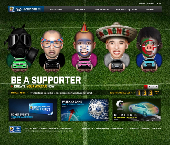 현대자동차는 3일 "현대자동차 2010 남아공 월드컵 마이크로사이트(fifaworldcup.hyundai.com)"를 개설하고 월드컵 붐 조성 및 브랜드 인지도 향상을 위한 적극적인 월드컵 마케팅에 나선다고 밝혔다.