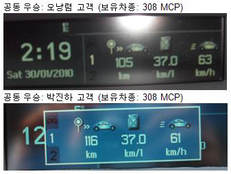 최종 우승은 308 MCP로 1리터에 37km를 주행한 오낭렴 씨와 박진하 씨가 공동으로 차지했다. 지난 1월 중간 결과 발표 때 33.3km/ℓ를 달려 중간 우승을 차지했던 오낭렴 씨는 본인의 종전 기록보다 무려 0.4km/ℓ를 더 주행하며 최종 우승의 영예를 안았다. 박진하 씨는 33km/ℓ에서 시작 37km/ℓ까지 올리는 무서운 뒷심을 보여주며 공동 챔피언 자리에 올랐다.공동 우승을 차지한 두 고객은 150만 원어치 주유상품권을 부상으로 받았다.