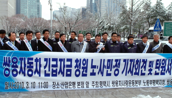 쌍용자동차 노·사·민·정 협의체는 평택시, 쌍용차 사랑운동본부, 쌍용차 노동조합 등 노·사·민·정 대표가 참석한 가운데 10일 오전 11시 여의도 산업은행 본점 정문 앞에서 쌍용차에 대한 긴급자금 지원을 청원하는 기자회견을 열고 이와 관련한 탄원서를 청와대, 국회, 지식경제부, 산업은행 등 관계기관에 전달했다고 밝혔다.