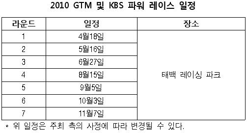 한편 올 시즌 GT마스터즈 대회는 태백레이싱파크가 주최하는 "2010 KBS 파워레이스 챔피언십(가칭)"과 함께 열린다.