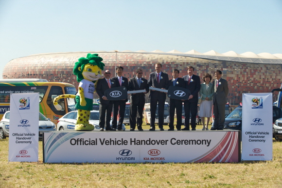 현대·기아자동차는 남아공 월드컵 개막을 3주 앞둔 20일(현지시각) 남아프리카공화국 요하네스버그 사커 시티에서 김성환 현대차 마케팅사업부장, 이장호 현대차 아프리카지역본부장, 이순남 기아차 해외마케팅실장 등 현대·기아차 관계자, 제롬 발케 FIFA 사무총장 등 FIFA 관계자와 현지 기자단이 참석한 가운데 대회 공식 자동차를 월드컵 조직위원회에 전달하는 행사를 가졌다.