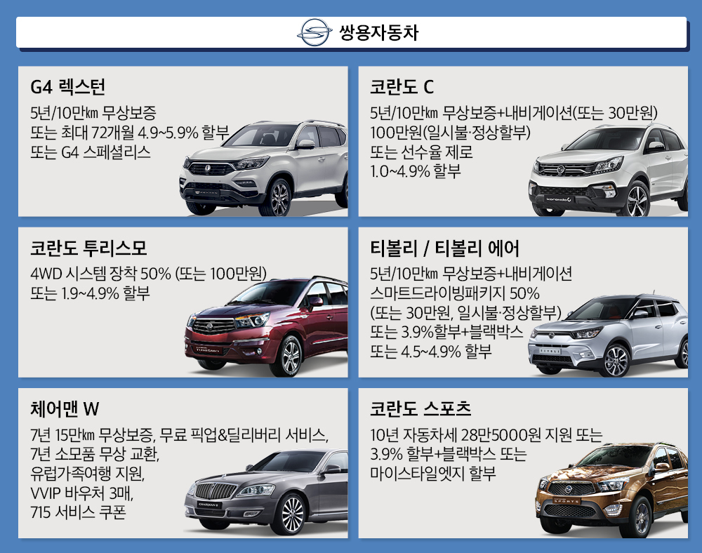 경형 및 준중형 승용차나 RV 보유자가 코란도 C 구입 시 20만원을, 국가 유공자와 장애우는 200만원 추가 할인해 준다. RV 보유자가 코란도 스포츠를 구입하면 10만원을, 여성 운전자가 티볼리를 출고하면 10만원을 지원한다. 사업자가 코란도 스포츠 및 코란도 투리스모를 구매 시 30만원을, 개업 1년 이내 신규 사업자는 50만원을 지원한다.