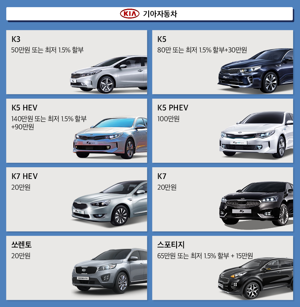 하이브리드차 보유자는 기아차 하이브리드 라인업을 30만원 저렴하게 구입할 수 있다. 18세 미만 다자녀 가구는 쏘렌토와 모하비, 카니발 출고 시 30만원을, 10년 경과 노후 경유차 교체 특별지원은 차종별 최대 120만원까지다.