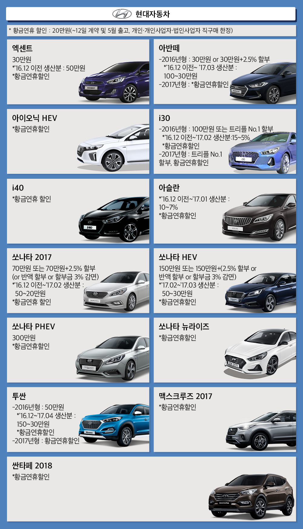 황금연휴 특별 할인으로 전 차종을 5월12일까지 계약한 후 5월 안으로 출고하면 20만원을 추가 할인한다(아니오닉 EV/PHEV, 제네시스, 신형 그랜저 제외). 2017년형 쏘나타는 선착순 2,000대 한정으로 10~15%의 할인율을 적용한다.