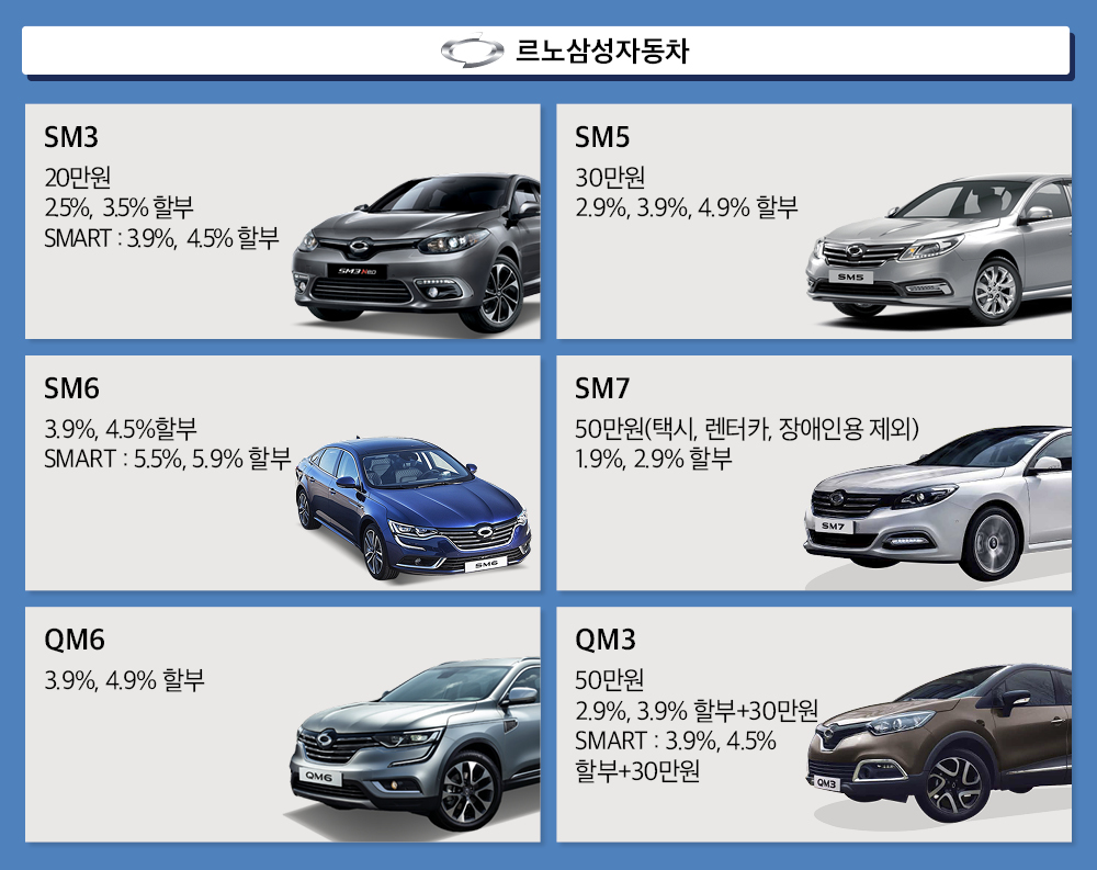 ▲르노삼성자동차 현금 구입 시 할인은 SM3 20만원, SM5 30만원, SM7 50만원(택시, 장애인용 제외), QM3 50만원이다. QM6는 트림 특별 프로모션으로 RE시그니처 2WD 구입 시 30만원, 4WD는 50만원을 특별 할인한다. 5년 이상 된 노후차 교체 후 SM6, QM6, QM3를 구입할 경우 50만원, SM3와 SM5, SM7 구입 시 30만원을 지원한다.