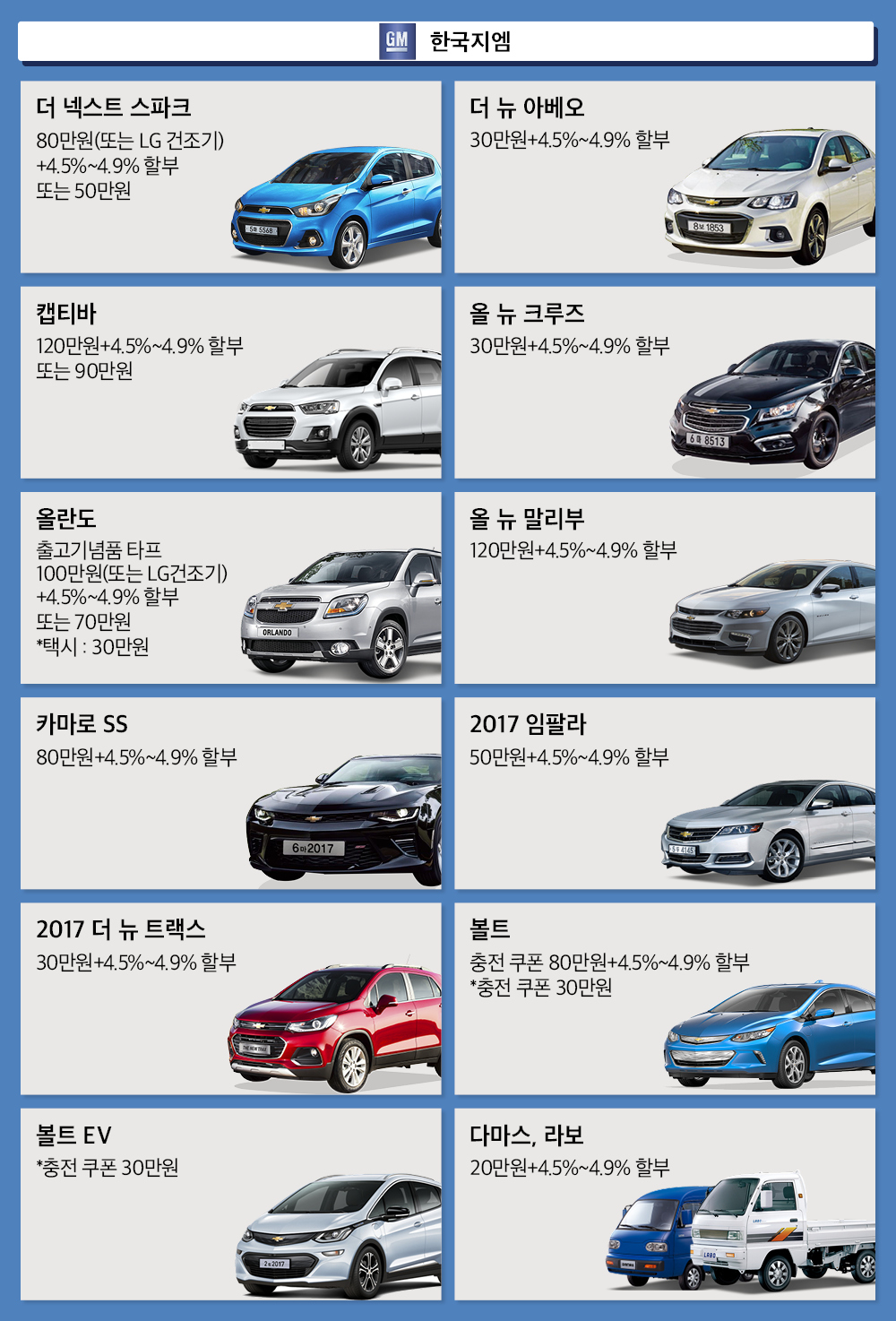 ▲쉐보레 가격 할인에 할부를 묶은 콤보 할부 프로그램을 이어간다. 이를 통해 말리부 구입 시 120만원을 할인하며 36~60개월 4.5~4.9% 할부 프로그램을 동시에 적용 받을 수 있다. 스파크와 올란도는 80만~100만원의 현금할인 또는 LG 건조기를 선택할 수 있으며, 이 경우에도 동일한 할부 프로그램으로 구입 가능하다. 올 뉴 크루즈는 30만원 할인과 최대 72개월(4.9%) 할부 혜택을 적용한다.
