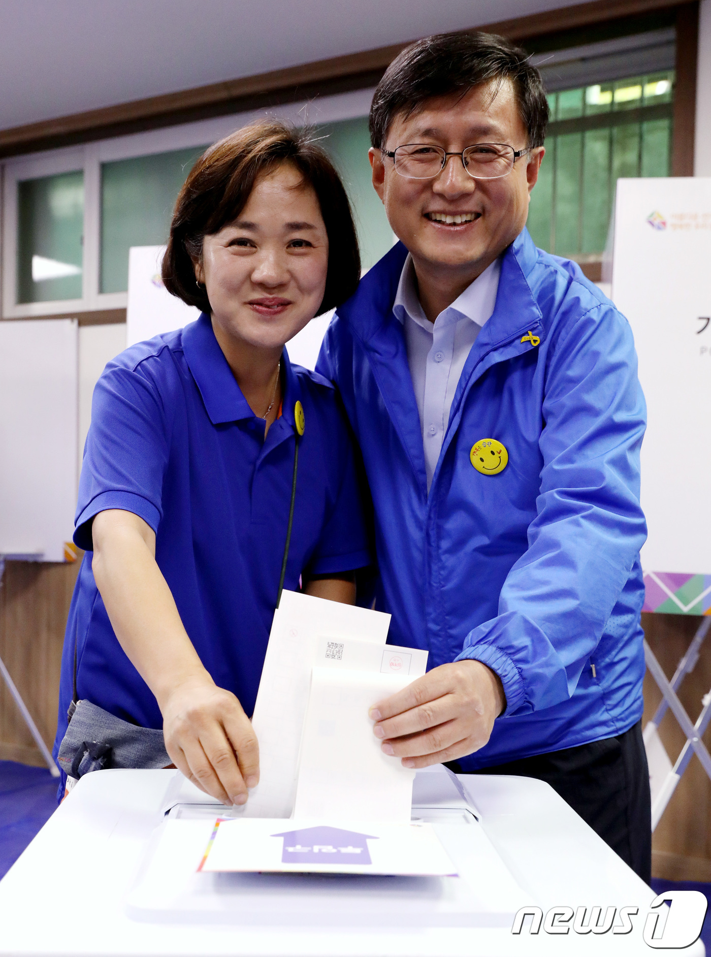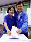김성환 노원병 국회의원 후보 내외, 밝은 표정으로 사전투표