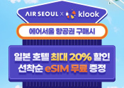 -클룩과 제휴 프로모션 전개 -숙박 20% 할인 쿠폰도 제공 에어서울이 클룩과 제휴해 일본 전 노선을 대상으로 숙박 20% 할인 및 e심 무료 증정 혜택을 제공한다고 5일 밝혔다. 에어서울은 이번 프로모션을 통해 도쿄, 오사카, 후쿠오카, 다카마쓰, 요나고 등 일본 ... 2025-09-05